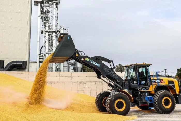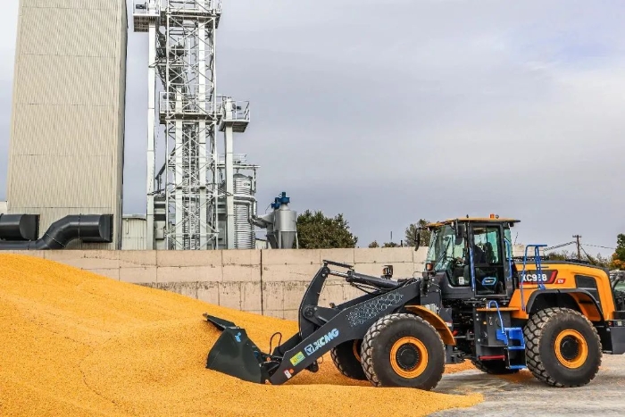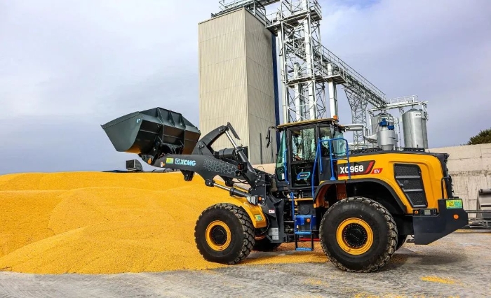 眼下,在欧洲某农产品加工厂,徐工XC968-EV纯电动装载机正迅速挥动大臂,翻动室外晾晒的谷物。