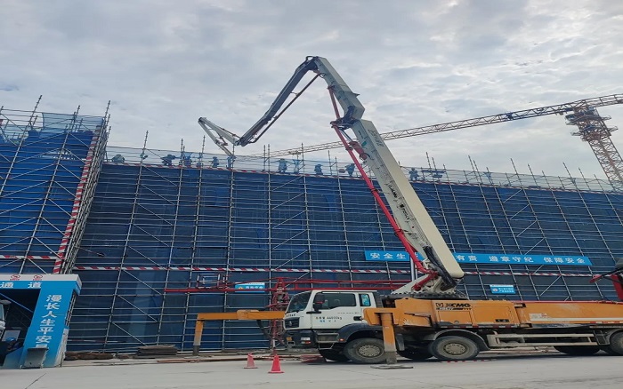 施工现场,臂架林立、机器运转,徐工成套混凝土机械联袂出击,新能源搅拌车、车载泵、泵车齐上阵,从混凝土运输、泵送施工、服务保障等方面守护项目顺利进行。