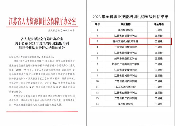 3月11日,学院获批由省人社厅评估通过的江苏省五星级职业技能培训机构,也是徐州市唯一一家上榜机构。